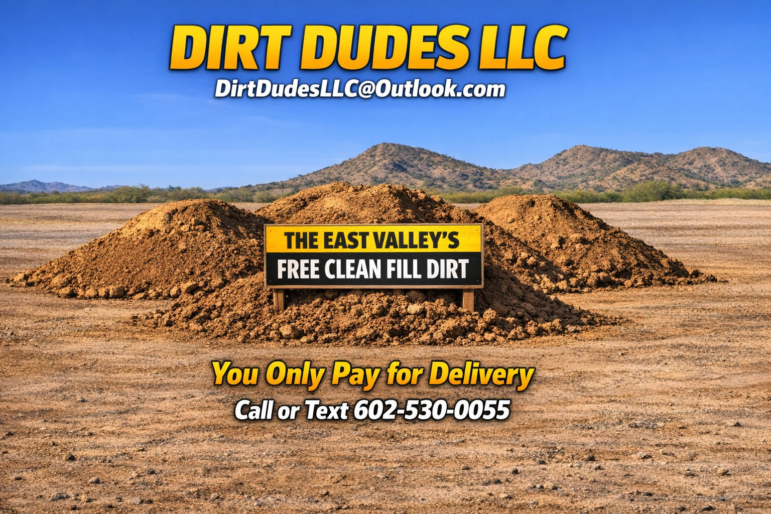 - Details: Dirt Dudes LLC, Offers 3-6 Ton Trailer Loads 7-10 Ton Truck Loads, and 20 Ton. Truck Loads. Of Back Fill, Clean, or Screened Dirt. Delivery Charge is based on your location Call Or Text 602-530-0055 Or Email DirtDudesLLC@Outlook.com